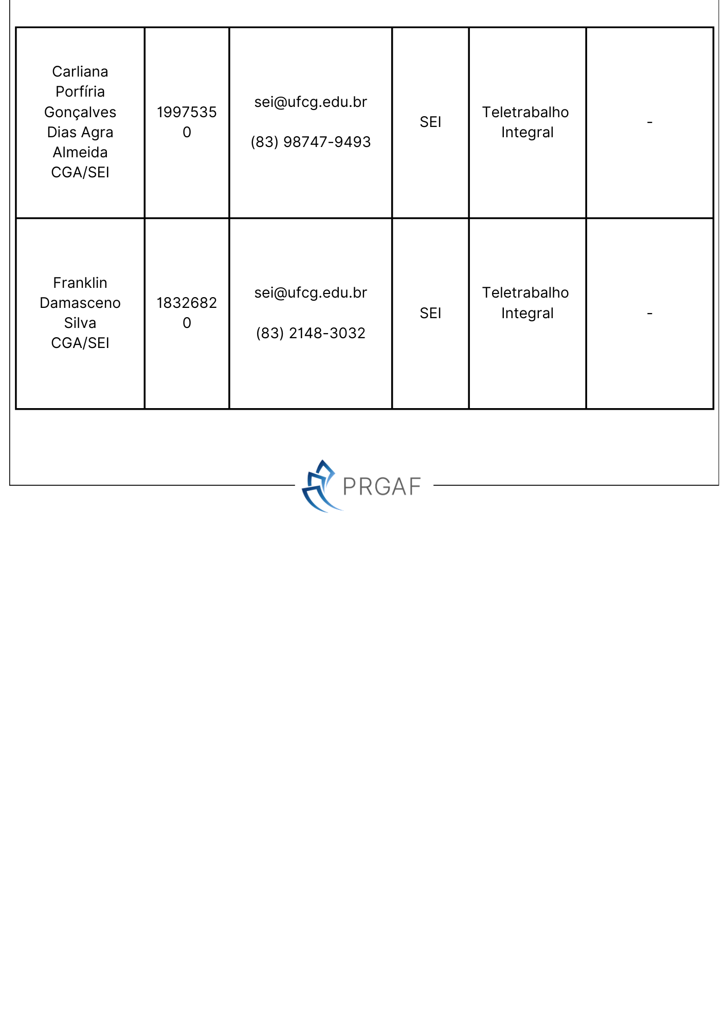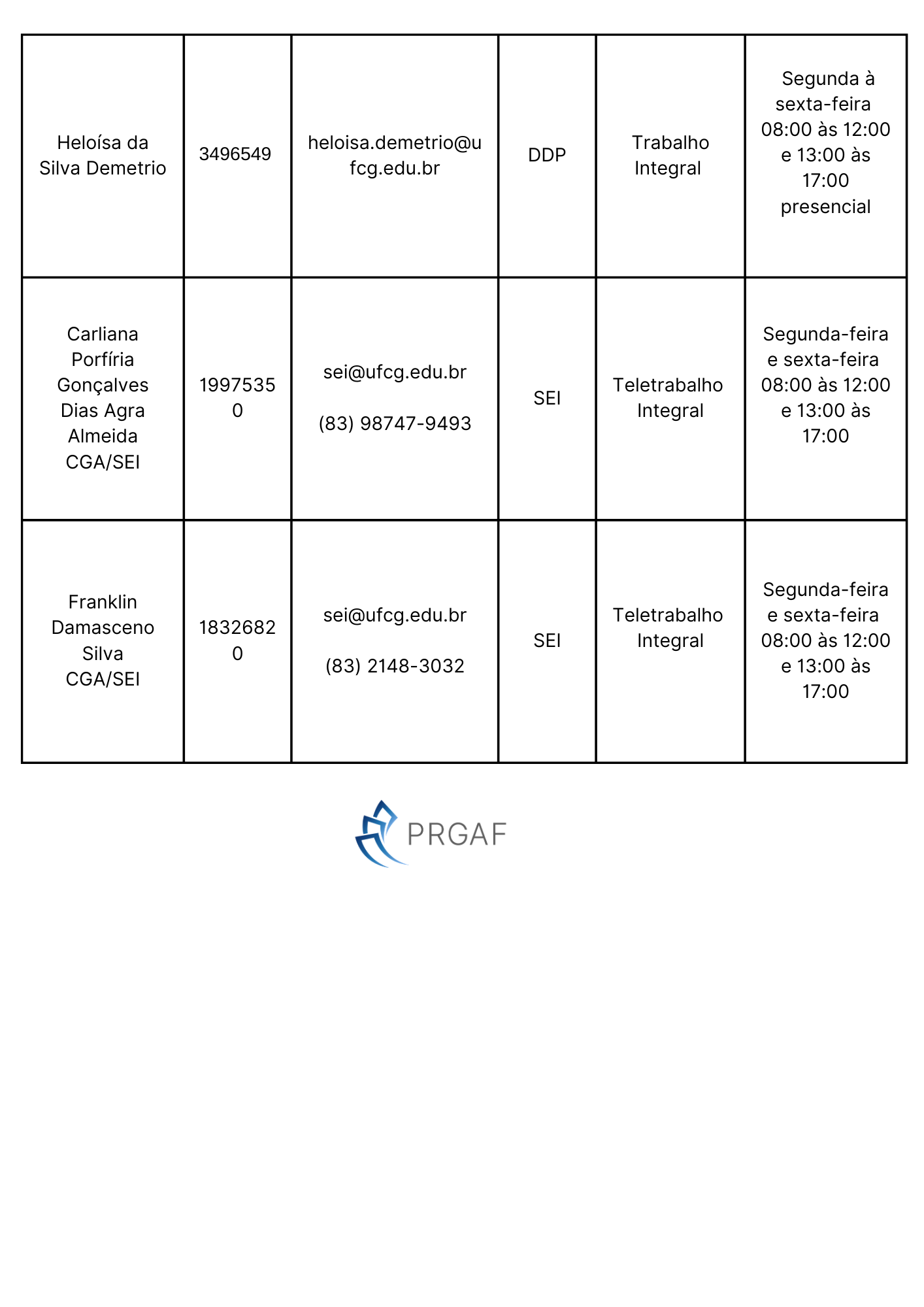 Planilha com os horários dos servidores da Pró-Reitoria de Gestão Administrativo-Financeira - PRGAF e da Coordenação Geral de Adminitração que estão na modadlidade telepresencial.