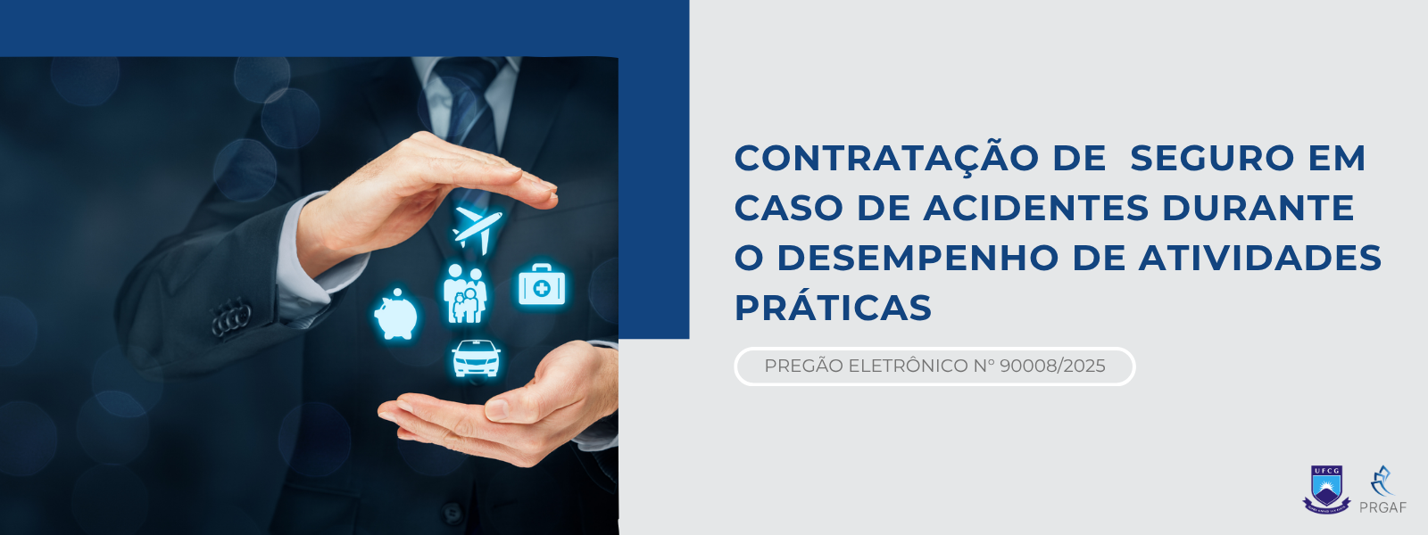 A Pró-Reitoria de Gestão Administrativo-Financeira torna público a documentação do Pregão Eletrônico Nº90008/2025, o objeto da presente licitação é a contratação de seguro contra acidentes pessoais, morte acidental, invalidez permanente total ou parcial, despesas médicas hospitalares, em caso de acidente durante o desempenho de atividades práticas, aos estudantes da Universidade Federal de Campina Grande (UFCG), matriculados em cursos de graduação ou cursos técnicos médio.