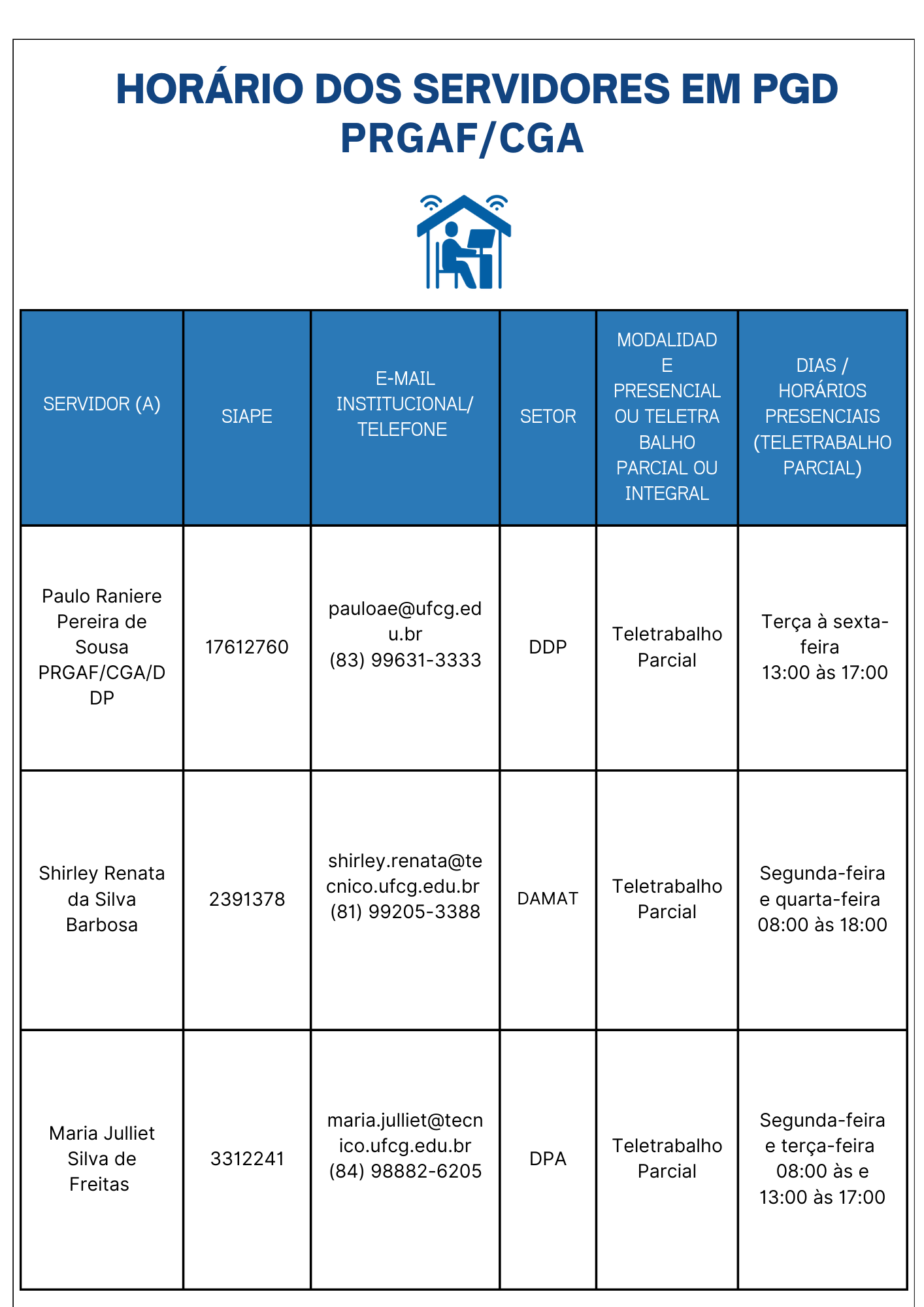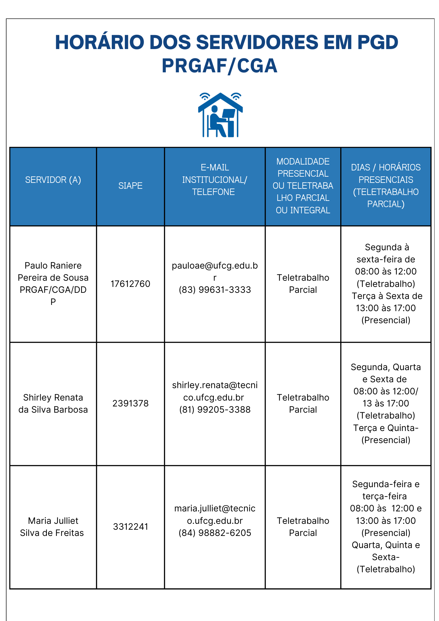 Planilha com os horários dos servidores da Pró-Reitoria de Gestão Administrativo-Financeira - PRGAF e da Coordenação Geral de Adminitração que estão na modadlidade telepresencial.