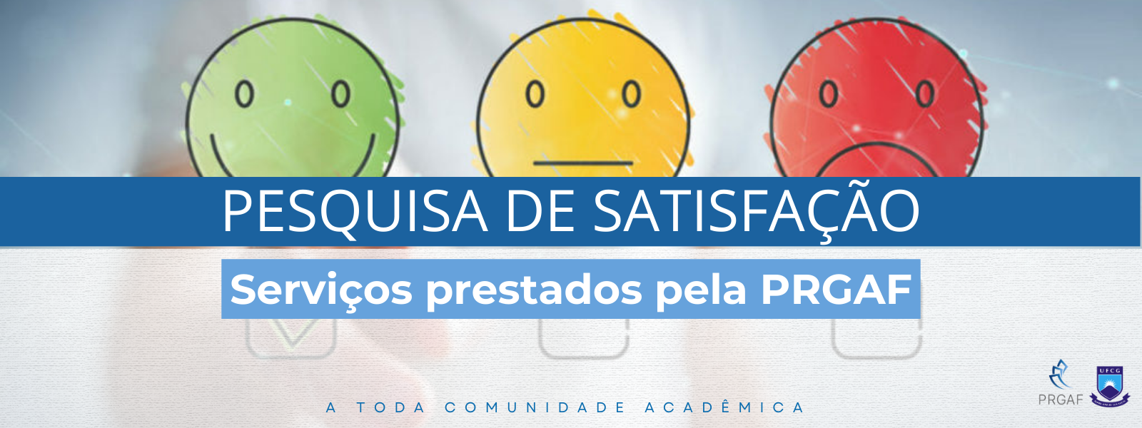 Viemos comunicar que foi lançada uma Pesquisa de Satisfação dos serviços prestados pela PRGAF junto à toda a comunidade acadêmica da UFCG. O objetivo é avaliar a qualidade dos nossos serviços prestados, para que possamos mapear nossos pontos fortes e fracos.