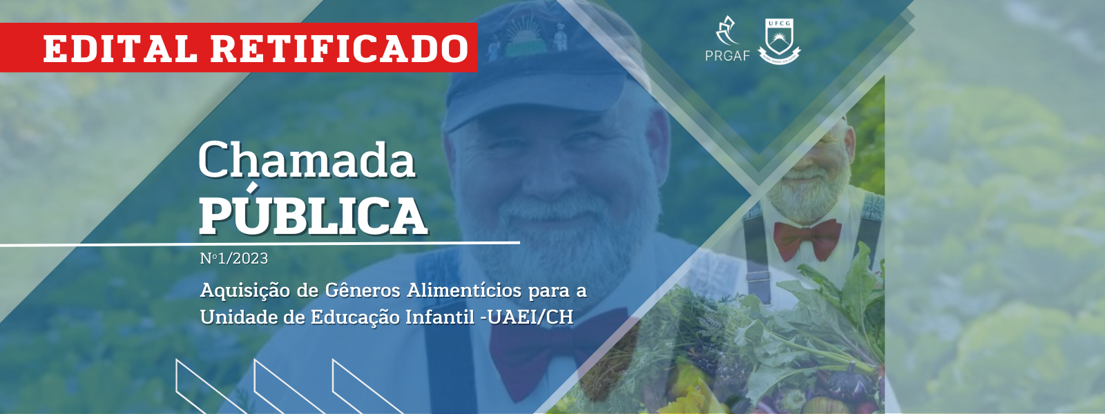A Pró-Reitoria de Gestão Administrativo Financeira (PRGAF) da Universidade Federal de Campina Grande (UFCG), no uso de suas atribuições legais, torna pública a realização da Chamada Pública para aquisição de alimentos de agricultores familiares e demais beneficiários que se enquadrem nas disposições da Lei nº 11.326, de 24 de julho de 2006, por meio da Modalidade Compra Institucional do Programa Aquisição de Alimentos, de acordo com a Medida Provisória Nº 1.166, de 22 de março de 2023, com dispensa de licitação, com fulcro no art. 34 da Lei nº 14.284, de 29 de dezembro de 2021, no art. 17 do Decreto nº 10.880, de 02 de dezembrode2021,e na Resolução GGPAB nº 03, publicada no DOU de 14 de junho de 2022. O período de 27 de março a 15 de abril de 2023. Os interessados deverão apresentar a documentação para habilitação e Proposta de Venda até o dia 17 de abril de 2023, às 09:00 horas na sala de reuniões da Comissão Permanente de Licitação, situada no prédio da Coordenação de Compras e Contratos da UFCG, Bloco AO (próximo à Prefeitura Universitária).